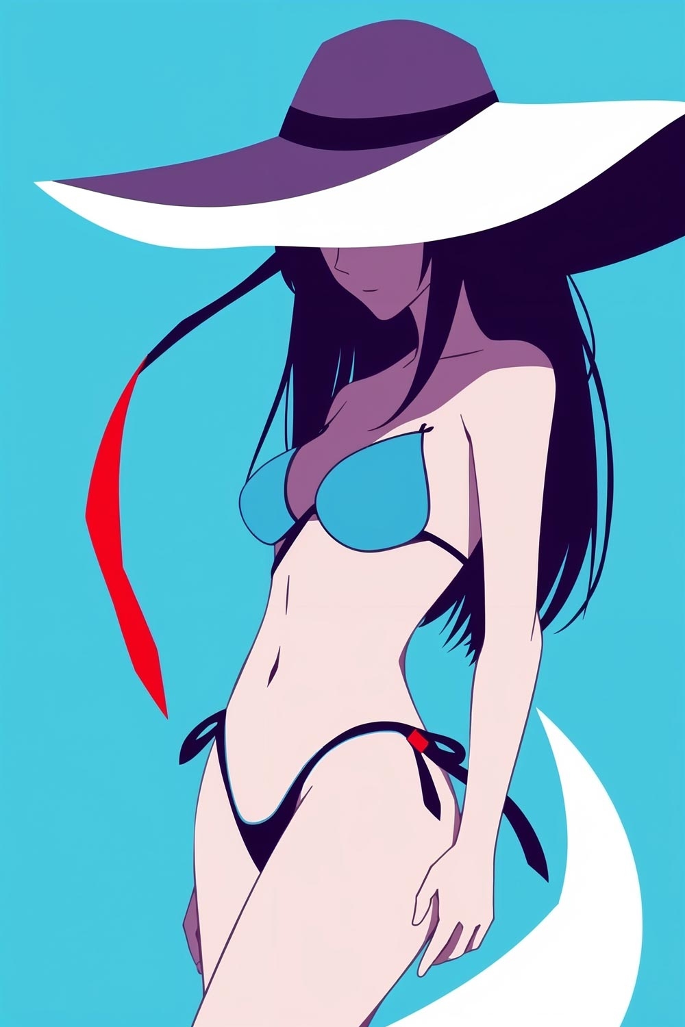 A bold anime pop art poster showcasing a sensual woman in minimal attire and a wide sun hat. With striking flat colors and sharp lines, this artwork adds an alluring and modern touch to any interior space.
