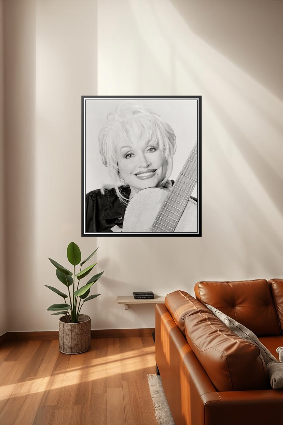 Celebrate the timeless beauty and warmth of Dolly Parton with this elegant black and white portrait poster. Featuring her radiant smile and signature charm with a guitar, it’s the perfect gift for country music fans and lovers of classic Americana. The monochrome tones bring sophistication and nostalgia to any living room, studio, or music-themed space. Printed on premium paper for crisp detail and archival quality, ready to frame or gift. A stunning tribute to a true legend.