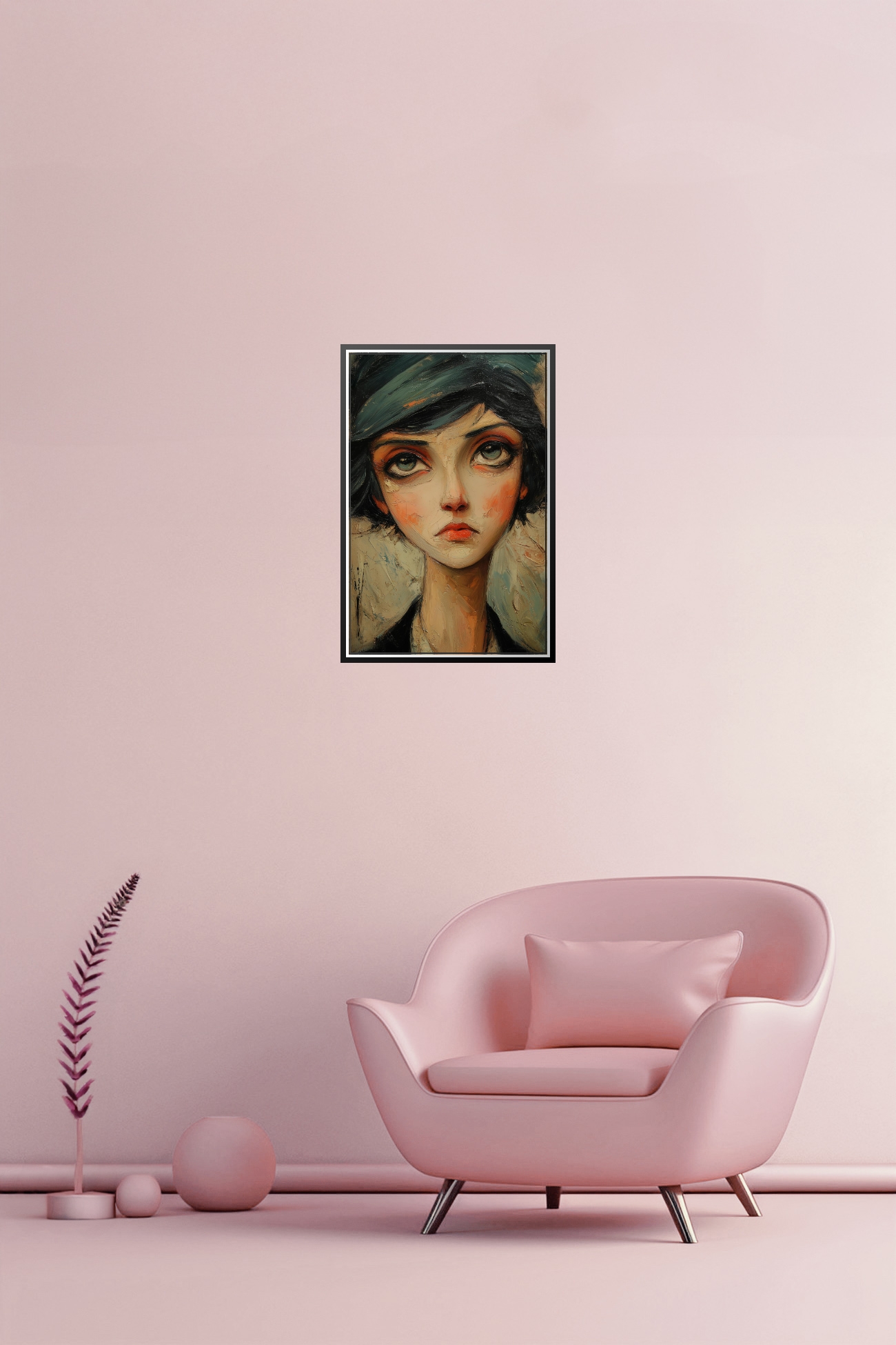 A deeply emotive Contemporary Expressionist portrait print featuring a woman with large, soulful eyes and a melancholic gaze. The artwork is characterized by bold, exaggerated features, heavy texture, and visible impasto-style brushstrokes, creating a powerful, raw, and modern aesthetic. The muted, earthy tones contrast with the vibrant red of the lips, highlighting the subject’s emotional intensity. This striking print is an ideal centerpiece for a modern living space or gallery wall.