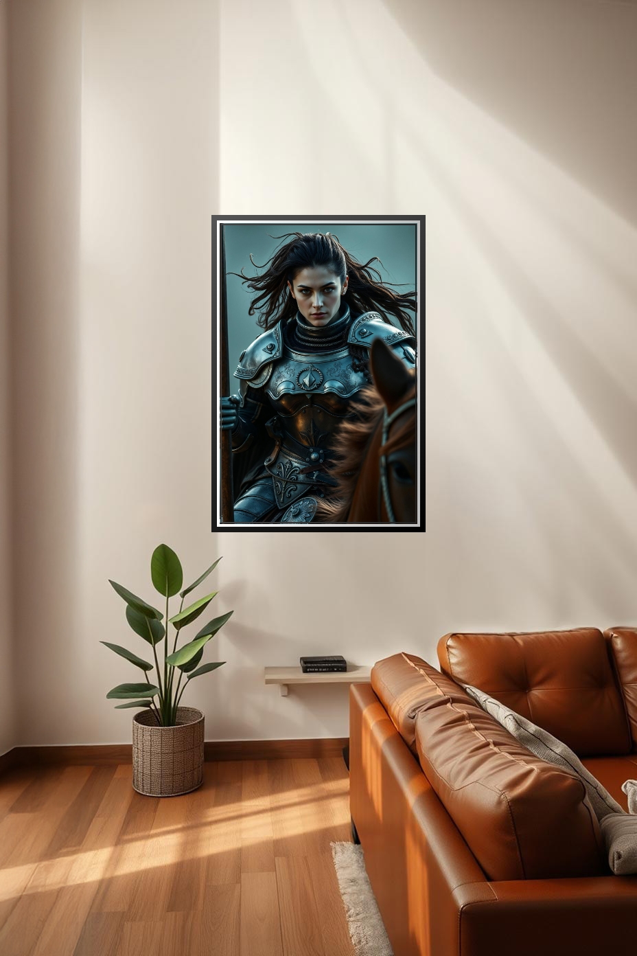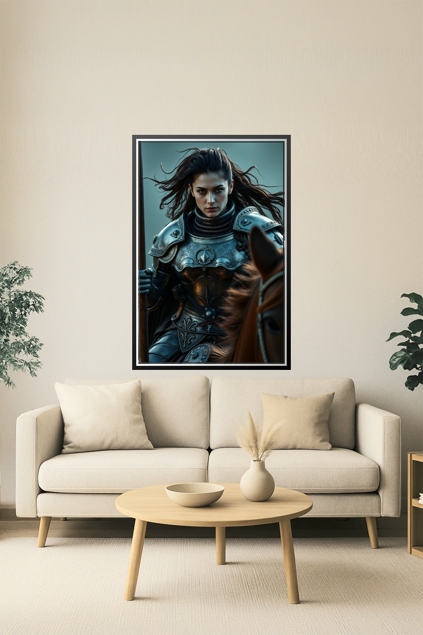 Commanding and fearless, this stunning poster depicts a powerful female knight in intricately detailed blackened armor. With a determined gaze and battle-ready stance, this artwork embodies strength, courage, and unyielding resolve. Perfect for lovers of medieval themes, fantasy warriors, and epic heroic art, it adds intensity and inspiration to any space.
