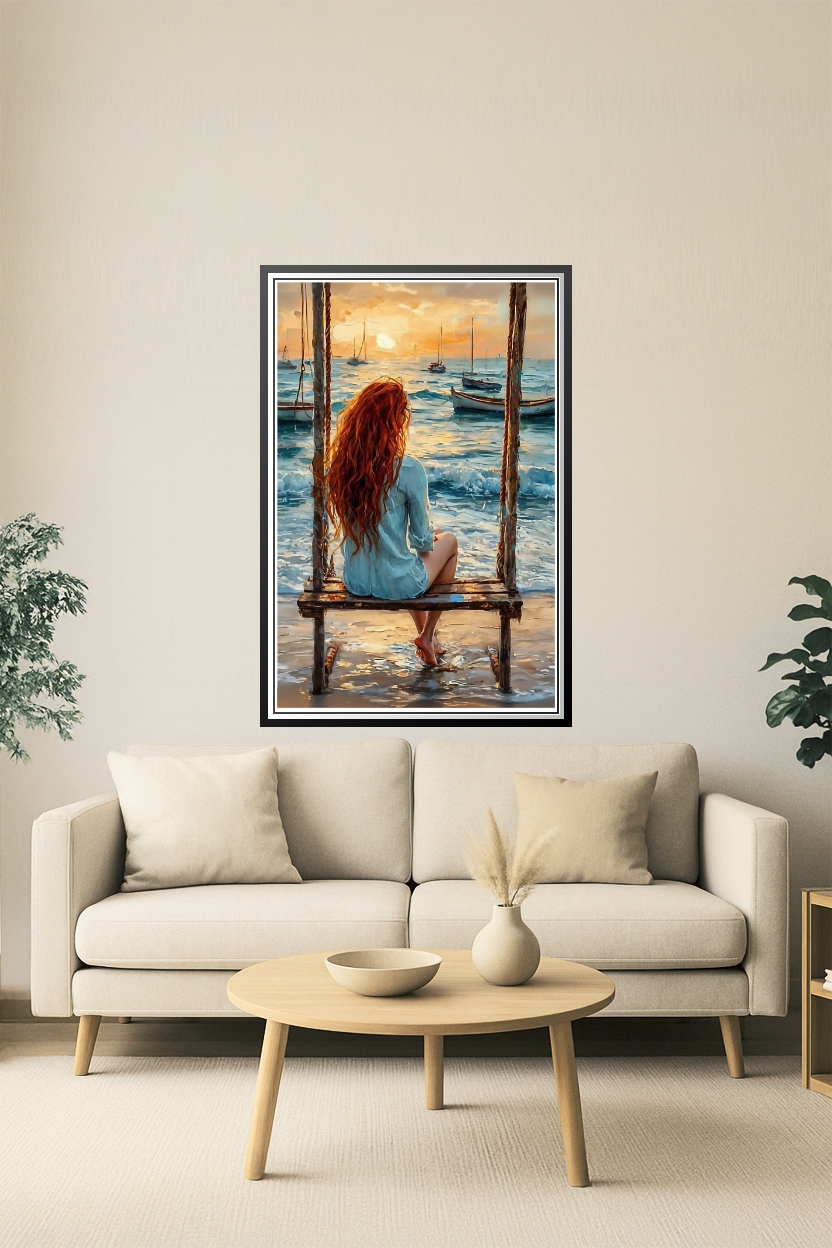 Immerse yourself in coastal tranquility with this Girl on Swing by the Sea Poster, painted in a luminous Impressionist oil style. The artwork depicts a red-haired woman seated on a wooden swing, gazing at the ocean as the sun sets over the horizon. With its glowing colors, gentle waves, and dreamlike texture, this piece evokes freedom, nostalgia, and serenity — perfect for beach homes, bedrooms, or art lovers seeking peaceful inspiration.