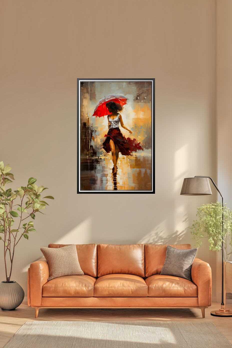 This captivating impressionist poster portrays a woman walking gracefully under a vivid red umbrella through a rain-soaked city street. The rich brushstrokes and warm color palette evoke a sense of romance, movement, and elegance. Perfect for adding a touch of passion and artistic charm to any home, studio, or gallery wall.