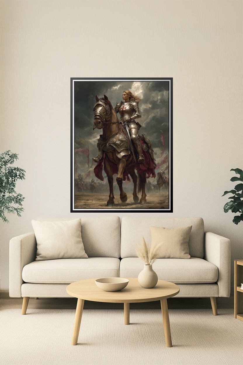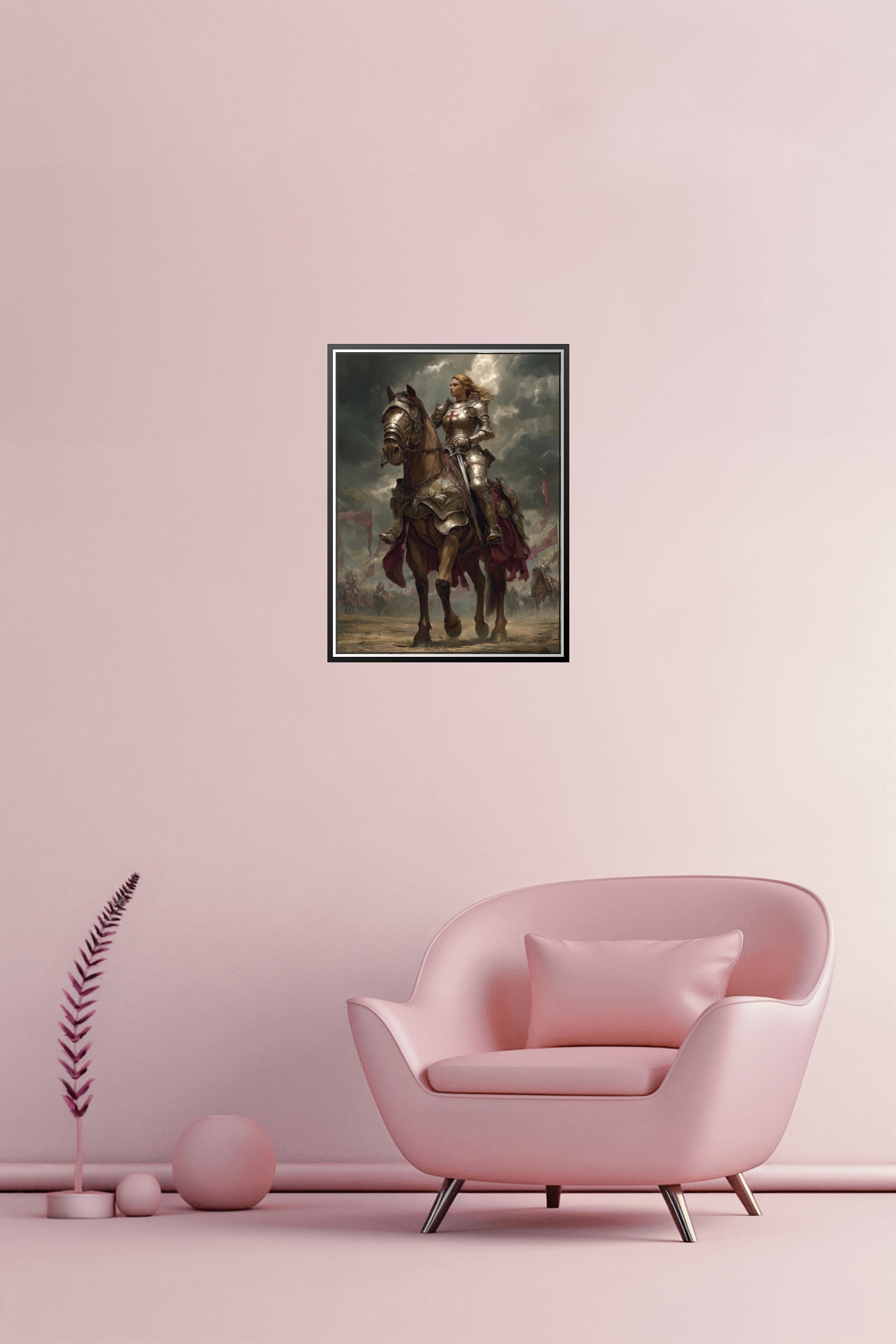 Bring timeless courage and strength to your walls with this epic medieval knight woman poster. Featuring a powerful female warrior in shining armor riding a majestic warhorse, this artwork captures the spirit of valor and fantasy battles. Perfect for fans of historical themes, chivalry, and fantasy art, this wall décor adds a bold and inspiring atmosphere to any space.