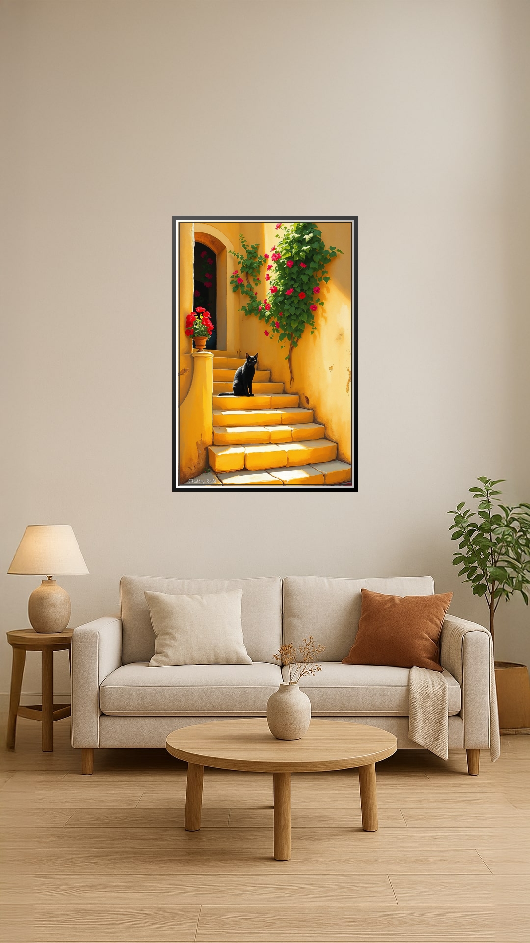 Bring home the warmth of the Mediterranean with this stunning impressionist-style art print featuring a sleek black cat resting gracefully on sunlit yellow stone steps. The vivid red flowers and golden tones create a dreamy atmosphere reminiscent of southern Europe’s timeless charm. Perfect for adding a cozy yet elegant touch to any living space or art collection.