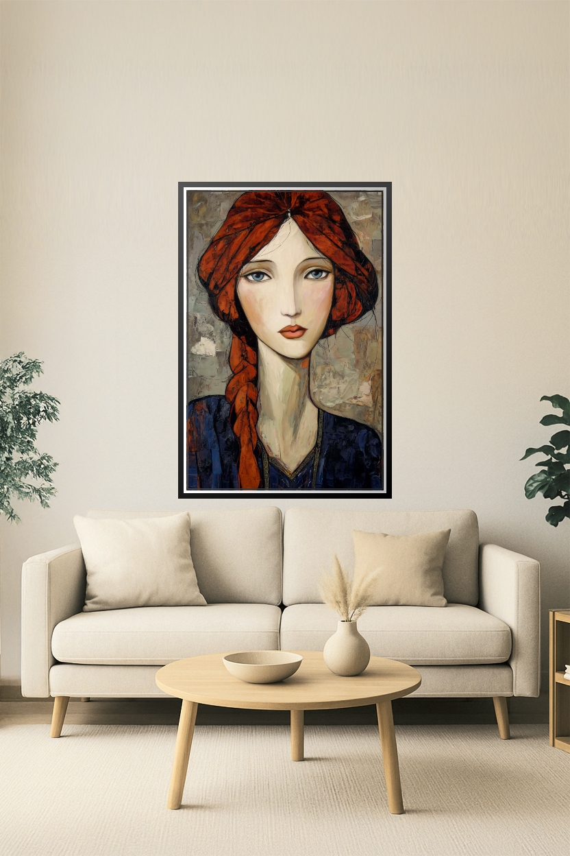 A striking art gift for admirers of modern portraiture and timeless feminine grace. This expressive painting captures a woman with flowing auburn hair and serene blue eyes, rendered in earthy tones and painterly texture—perfect for living rooms, studios, or elegant bedrooms. Printed on premium matte paper for vivid color and detail, ready to gift or frame beautifully. A refined statement piece that adds poise and warmth to any space.