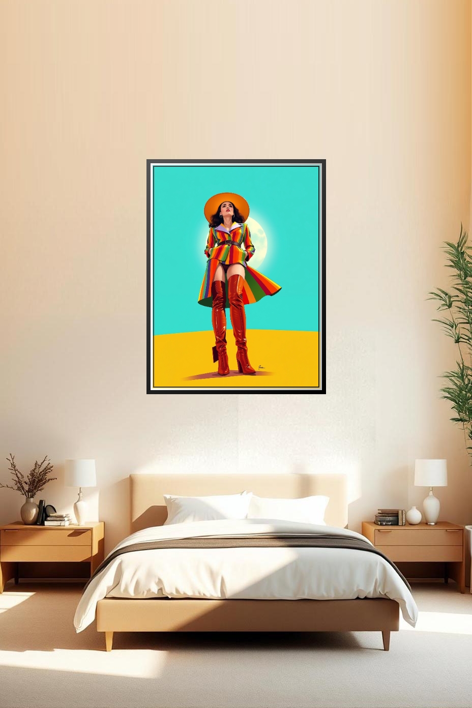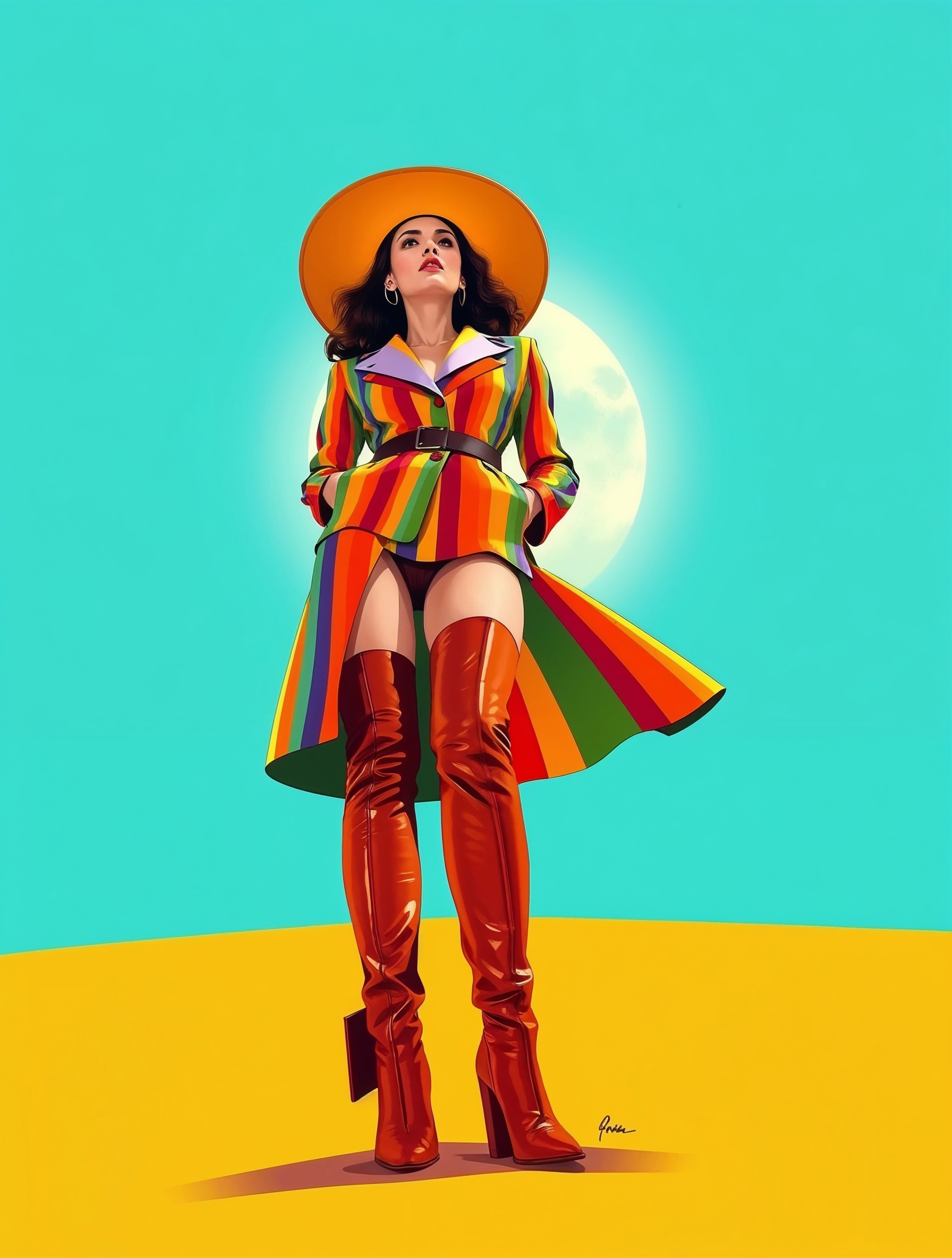 Inspired by Rod Stewart’s iconic song “Hot Legs,” this pop art poster celebrates feminine power and fearless allure — a perfect gift for music lovers and fashion enthusiasts. The vibrant rainbow coat, fiery boots, and turquoise sky radiate 1970s glam with a modern pop twist, perfect for bedrooms, lounges, or creative spaces. Printed on premium semi-gloss paper with vivid color and smooth texture. Striking solo or as part of a retro music-inspired wall gallery.