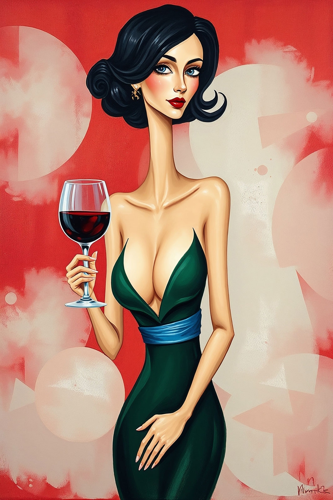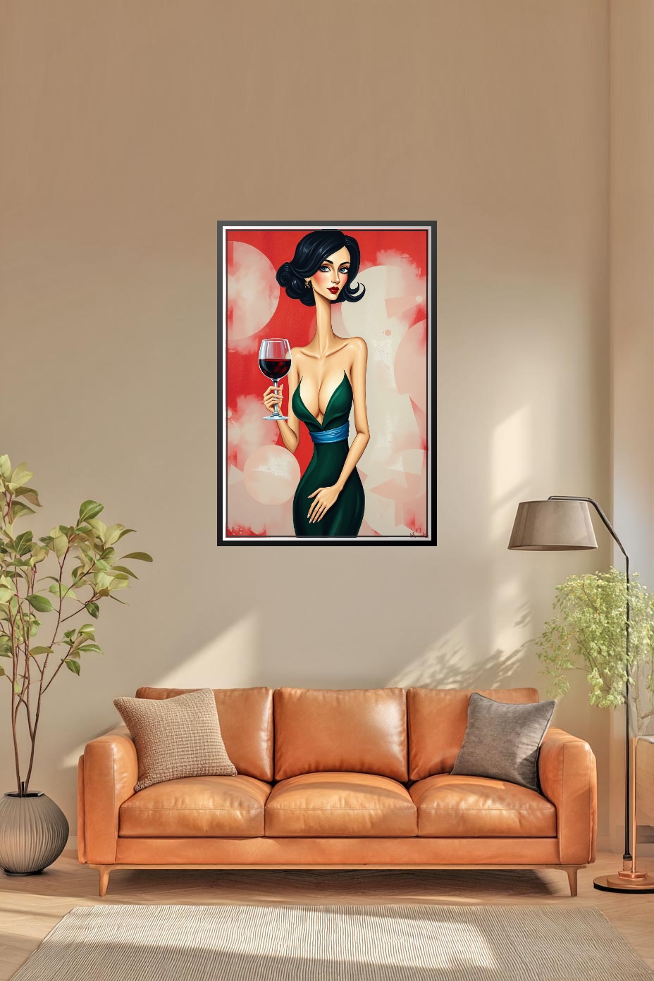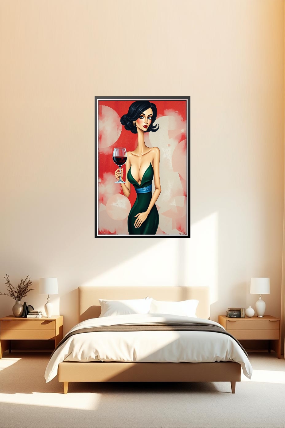 This stylish pop art piece features a confident woman with a glass of wine, making it an ideal gift for wine lovers, home bar owners, and fans of glamorous retro artwork. Bold reds, soft blush tones, and deep greens create a warm, modern vibe perfect for kitchens, dining rooms, lounges, or entertainment spaces. Printed on premium archival paper for vivid color, crisp lines, and a smooth finish. Looks stunning as a standalone focal point or paired with other wine-themed or pop art prints.