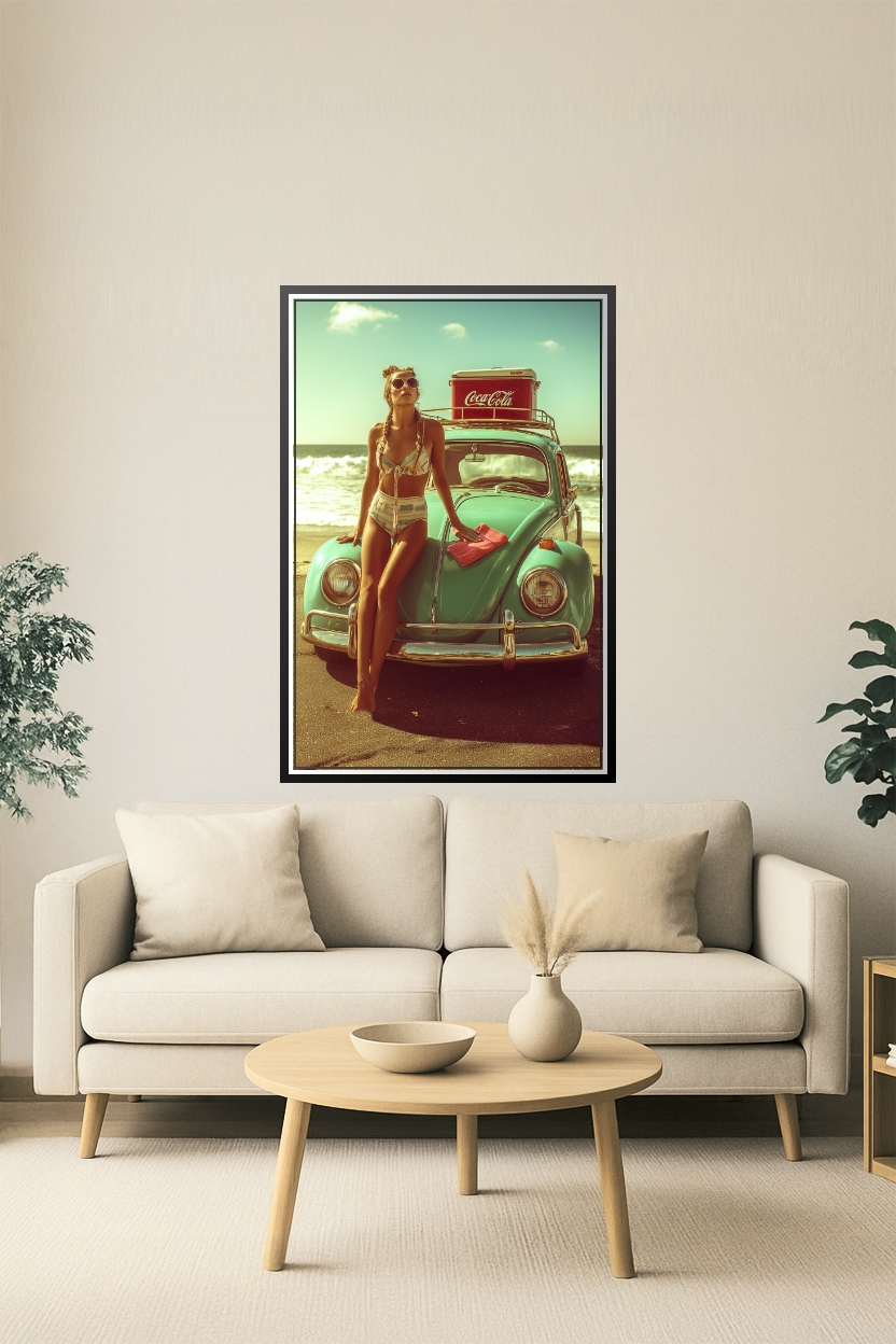 Capture endless summer energy with this retro-inspired beach girl poster, a perfect gift for vintage car fans and sun lovers alike. Ideal for a living room, lounge, or beach house, it radiates carefree 1960s charm with warm golden tones and turquoise hues. Printed on premium archival paper for vivid color and lasting quality, ready to frame or gift. A standout piece that brings sunshine to any wall.