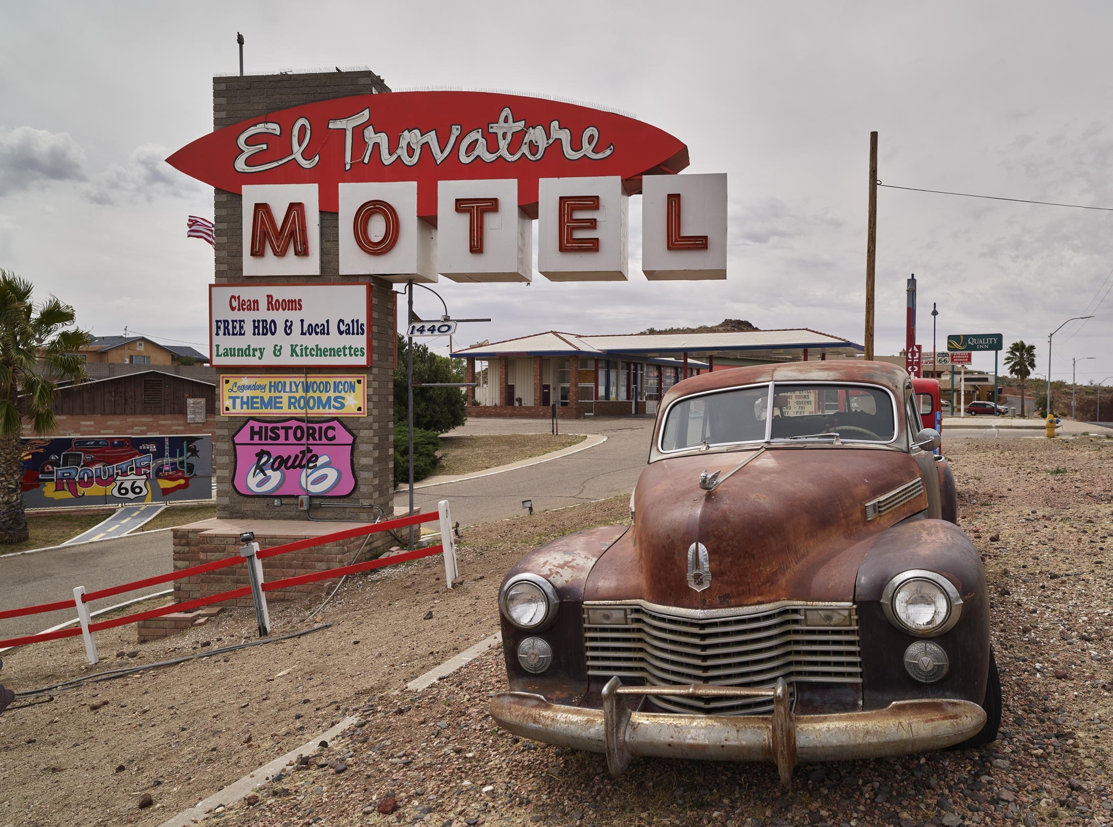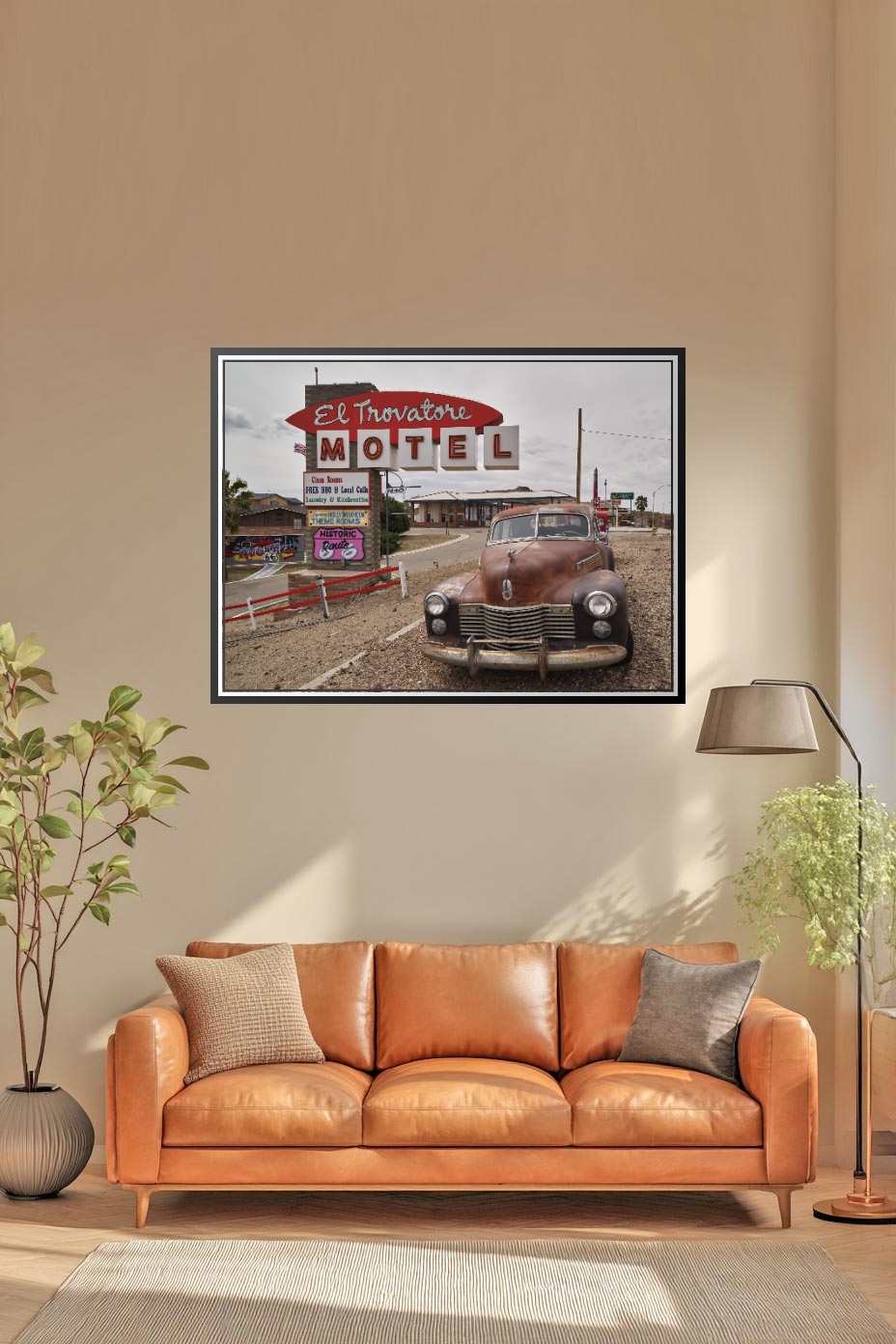 A nostalgic gift for travel lovers and fans of classic Americana. This vintage scene captures the iconic El Trovatore Motel on Route 66, complete with its bold neon sign and weathered classic car. Perfect for living rooms, lounges, or offices that celebrate mid-century road trip charm. Printed on premium archival paper with warm retro tones for an authentic feel. A timeless piece that evokes the spirit of freedom and adventure.